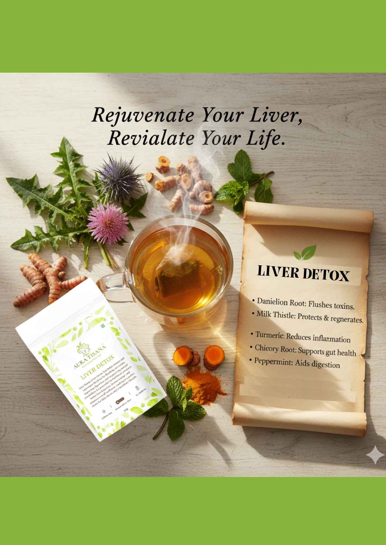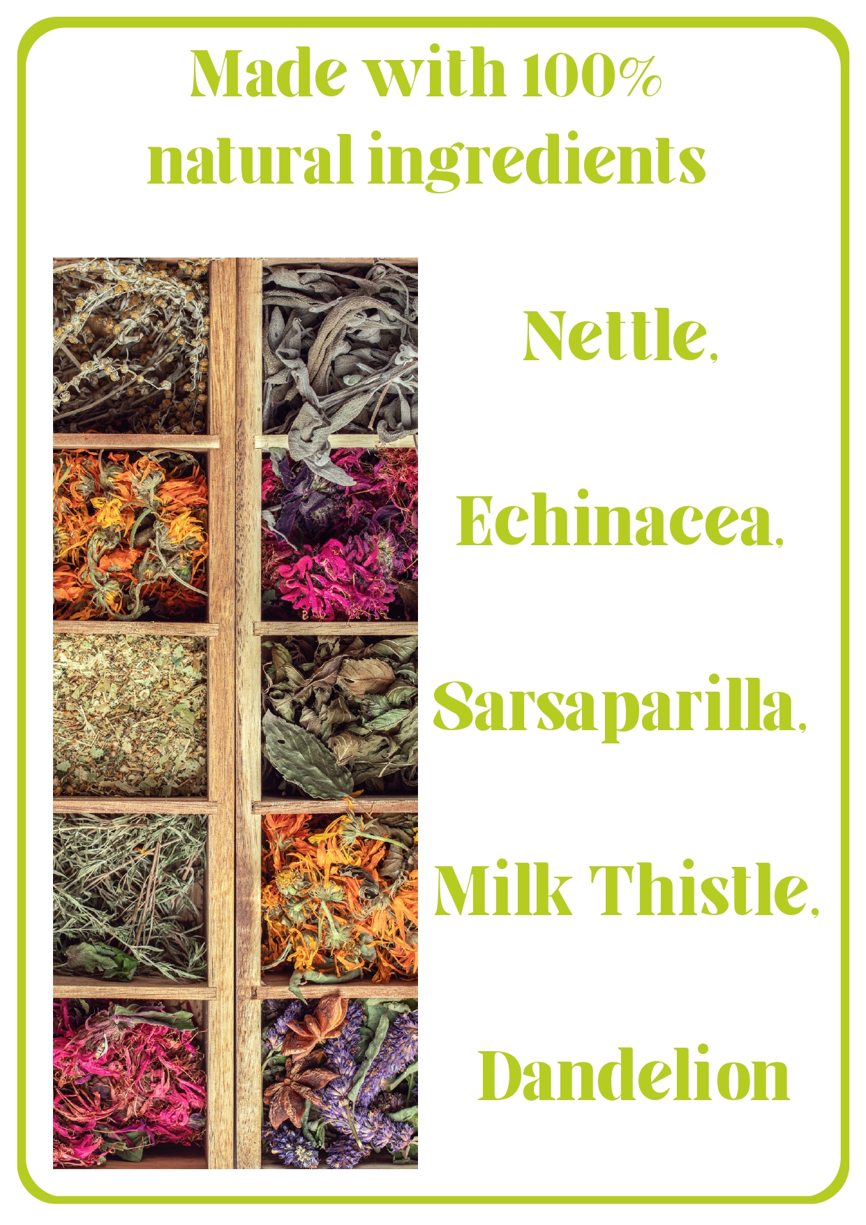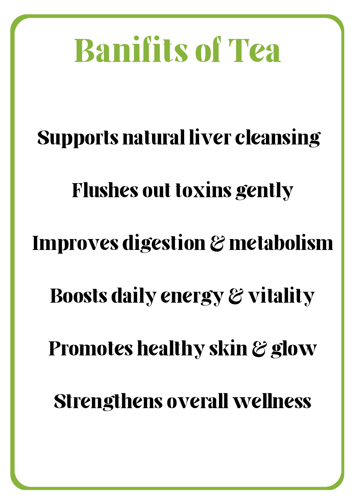 A gentle, caffeine-free herbal tisane crafted to support natural liver cleansing and daily vitality. Made with botanicals like Nettle, Echinacea, Sarsaparilla, Milk Thistle, and Dandelion, it helps the body flush toxins while nurturing digestion, skin health, and overall wellness.