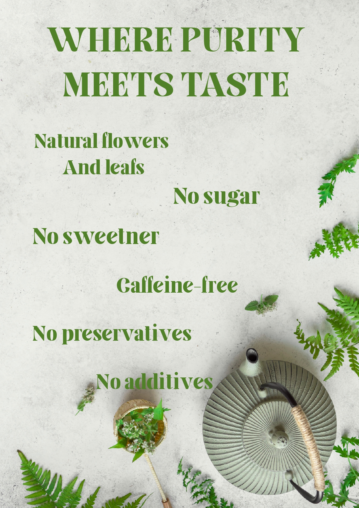 Caffeine-free; no sugar, sweeteners, preservatives, or additives