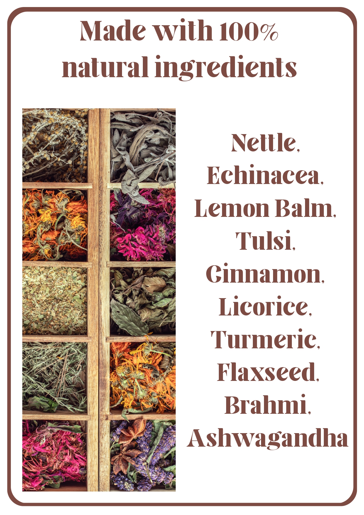 A focused, caffeine-free herbal blend crafted to support healthy thyroid function and daily vitality. Made with natural botanicals like Nettle, Echinacea, Lemon Balm, Tulsi, Cinnamon, Licorice, Turmeric, Flaxseed, Brahmi, and Ashwagandha, this soothing tisane is designed to help balance hormones, boost metabolism, and sharpen mental clarity.