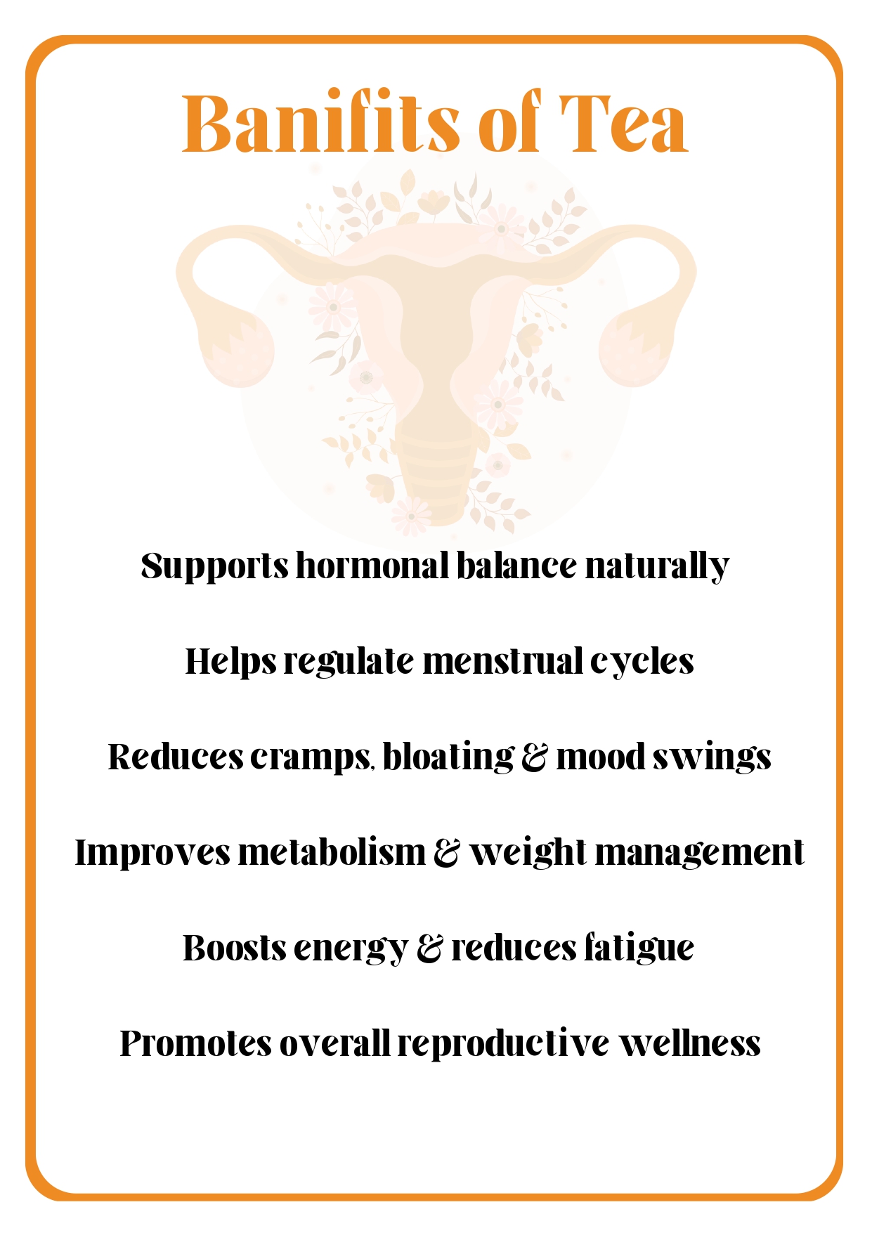 A soothing, caffeine-free herbal blend crafted to support hormonal balance and overall reproductive wellness. Made with natural ingredients like Chamomile, Nettle, Moringa, Amla, Cinnamon, Ginger, Shatavari, Fennel, Peppermint, Celery, Shankhpushpi, Punarnava, Manjishtha, Cardamom, Fenugreek, Turmeric, and Cumin, it helps ease monthly discomfort while supporting metabolism and daily vitality.